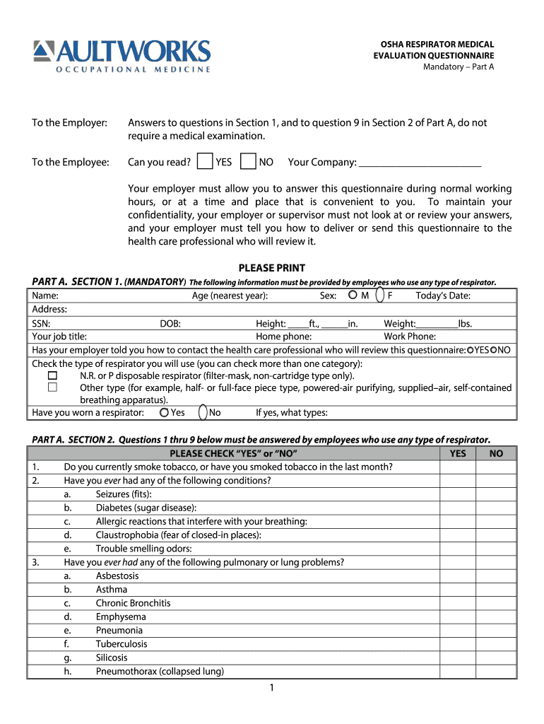 OSHA RESPIRATOR MEDICAL EVALUATION QUESTIONNAIRE Mandatory Part ATO the Employer:Answers to questions in Section 1, and to question 9 in Section 2 of Part A, do not require a medical examination.