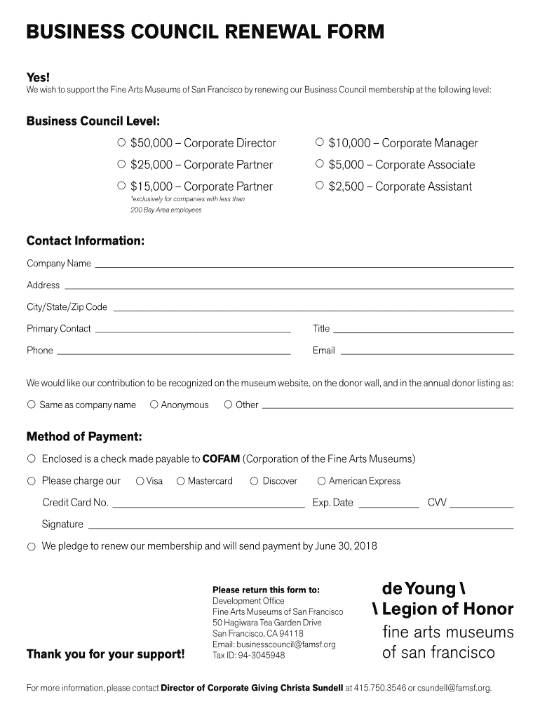BUSINESS COUNCIL RENEWAL FORM Yes! We wish to support the Fine Arts Museums of San Francisco by renewing our Business Council membership at the following level:Business Council Level: $50,000 Corporate