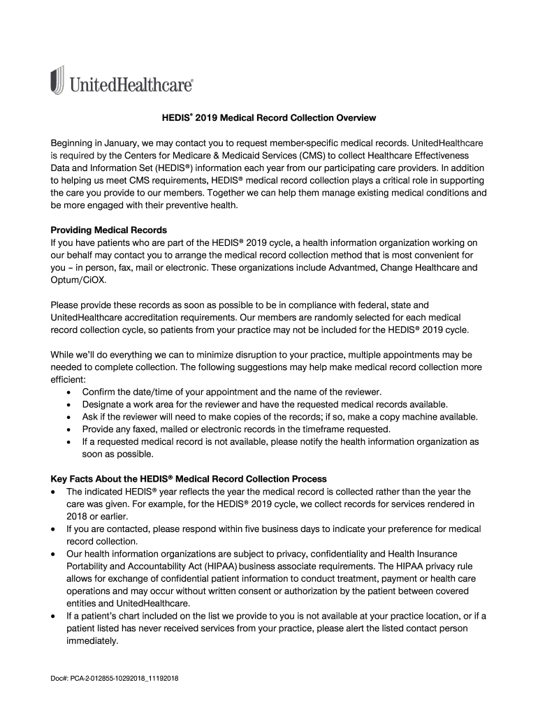 FEDIS 2019 Medical Record Collection Overview Beginning in January, we may contact you to request member specific medical records. UnitedHealthcare is required by the Centers for Medicare & Medicaid
