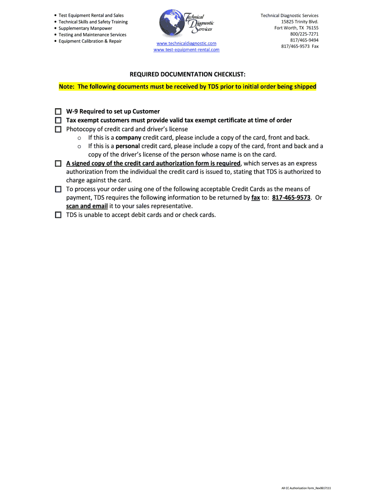 Any customer of Technical Diagnostic Services who needs to authorize charges for equipment rental or purchases can use this form. Both authorized users and management must sign it.