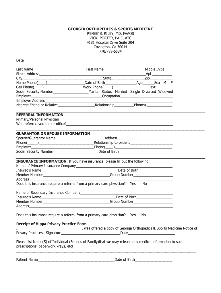 The Georgia Orthopedics Patient Intake Form is a medical document used by new patients to provide essential personal, medical, and insurance information for evaluation and treatment at Georgia Orthopedics & Sports Medicine.