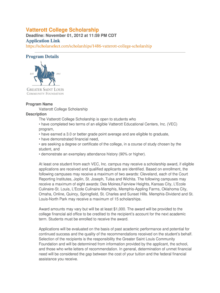 Vatterott College Scholarship Deadline: November 01, 2012, at 11:59 PM CDT Application Link https://scholarselect.com/scholarships/1486-vatterott-college-scholarship Program Details Program Name Vatterott
