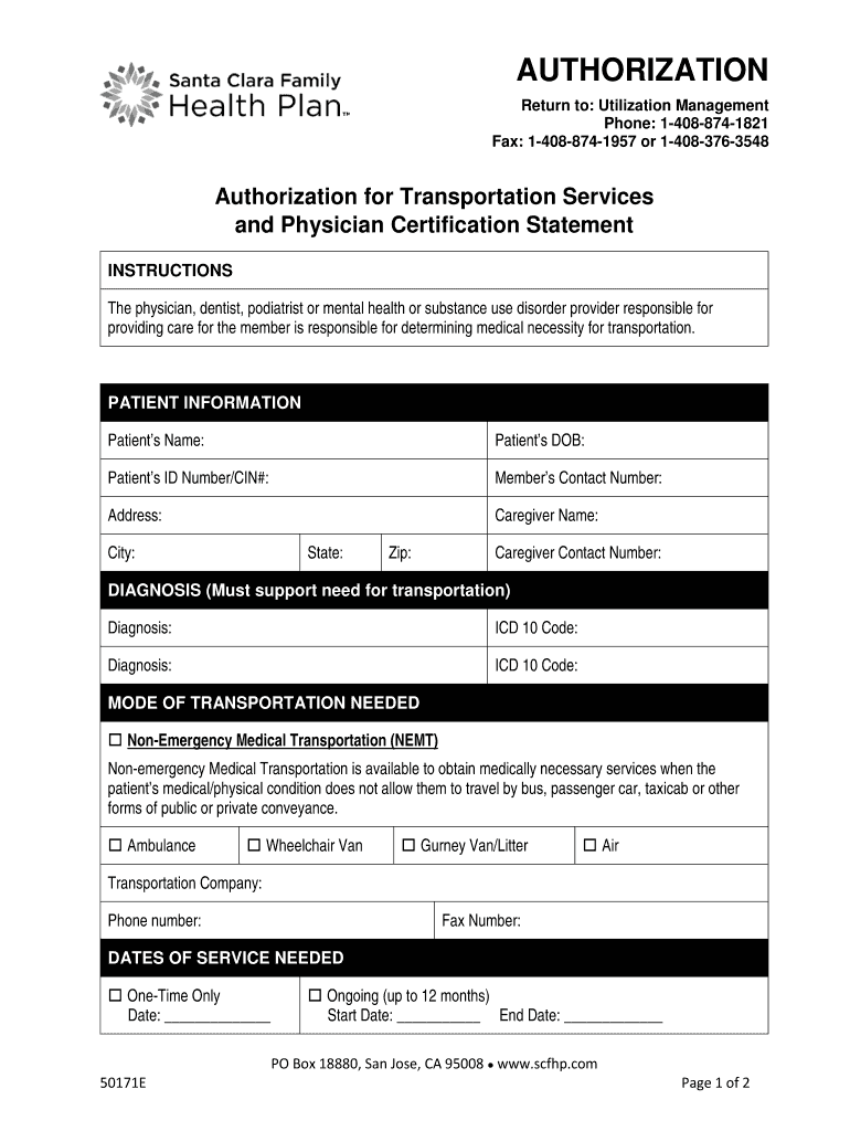 Fax: 14088741957 or 14083763548Authorization for Transportation Services