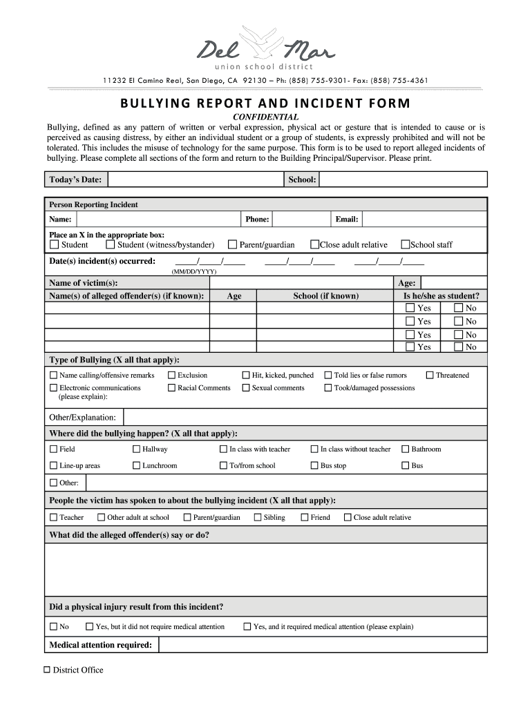 11232 El Camino Real, San Diego, CA 92130 pH: (858) 7559301 Fax: (858) 7554361 BULLYINGREPORTANDINCIDENTFORMCONFIDENTIAL Bullying, defined as any pattern of written or verbal expression, physical