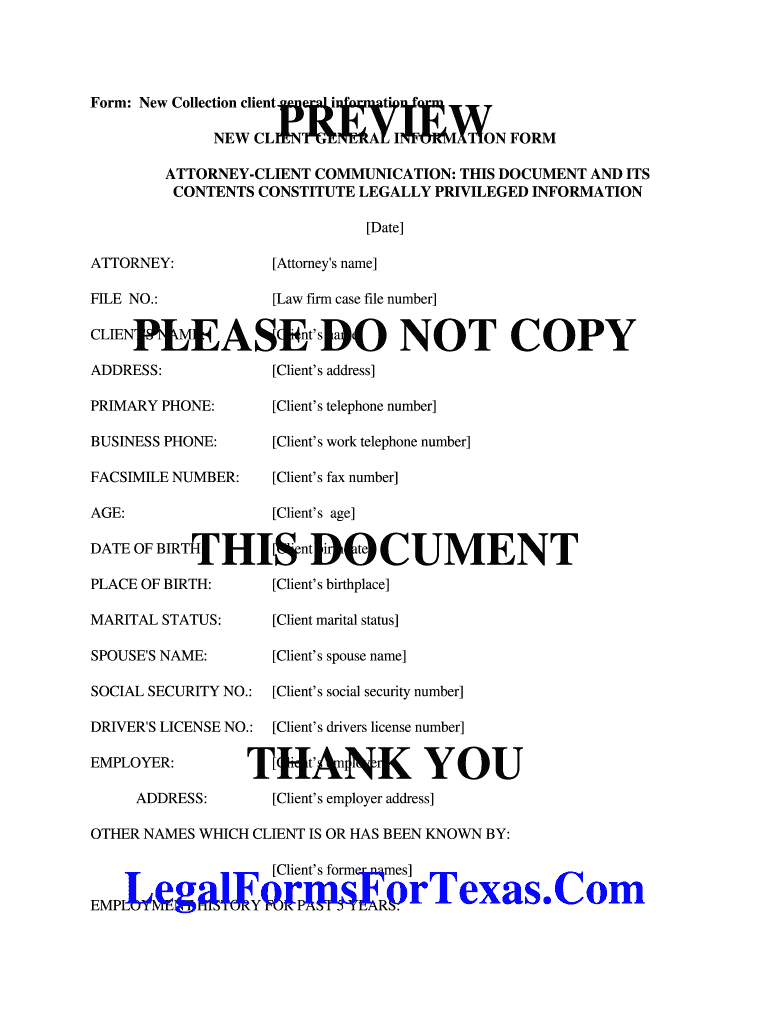 Form: New Collection client general information form PREVIEW NEW CLIENT GENERAL INFORMATION FORM ATTORNEY-CLIENT COMMUNICATION: THIS DOCUMENT AND ITS CONTENTS CONSTITUTE LEGALLY PRIVILEGED INFORMATION