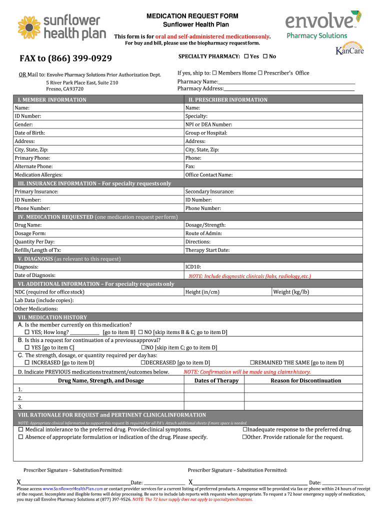 MEDICATION REQUEST FORM Sunflower Health Plan This form is for oral and self administered medications only. For buy and bill, please use the biopharmacy request form. FAX to (866) 3990929SPECIALTY