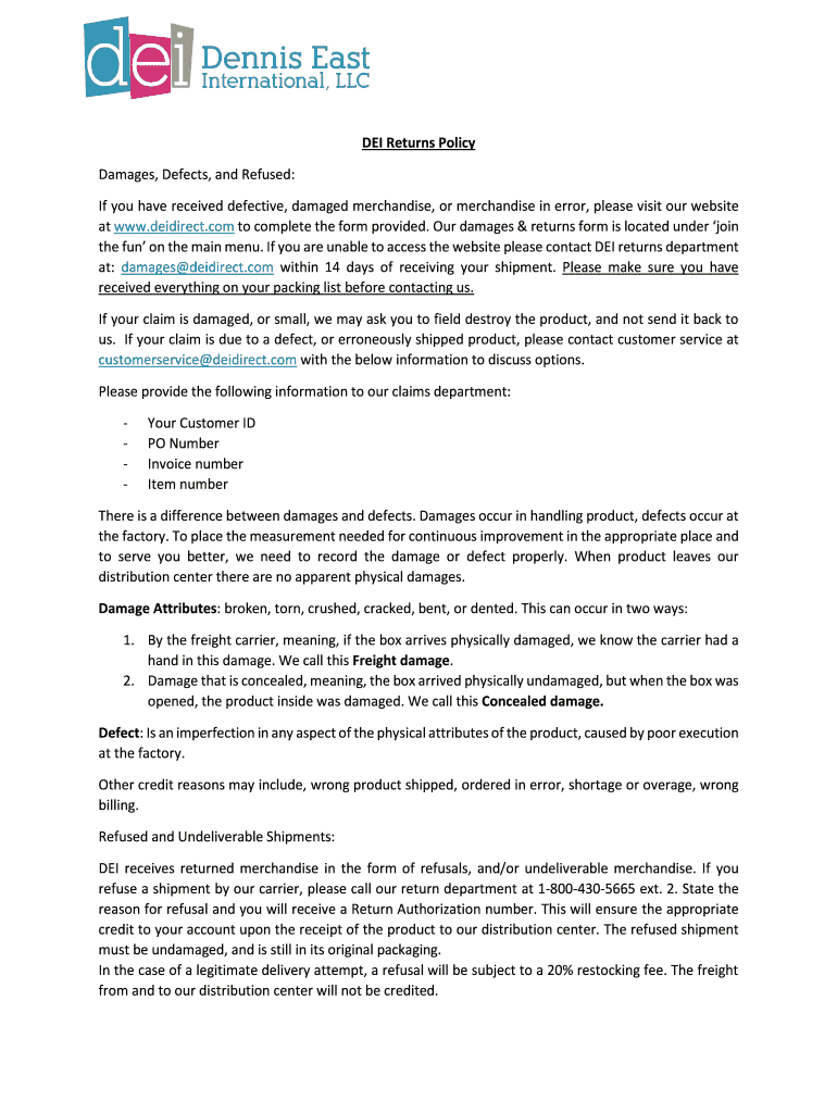 DEI Returns Policy Damages, Defects, and Refused: If you have received defective, damaged merchandise, or merchandise in error, please visit our website at www.deidirect.com to complete the form provided.