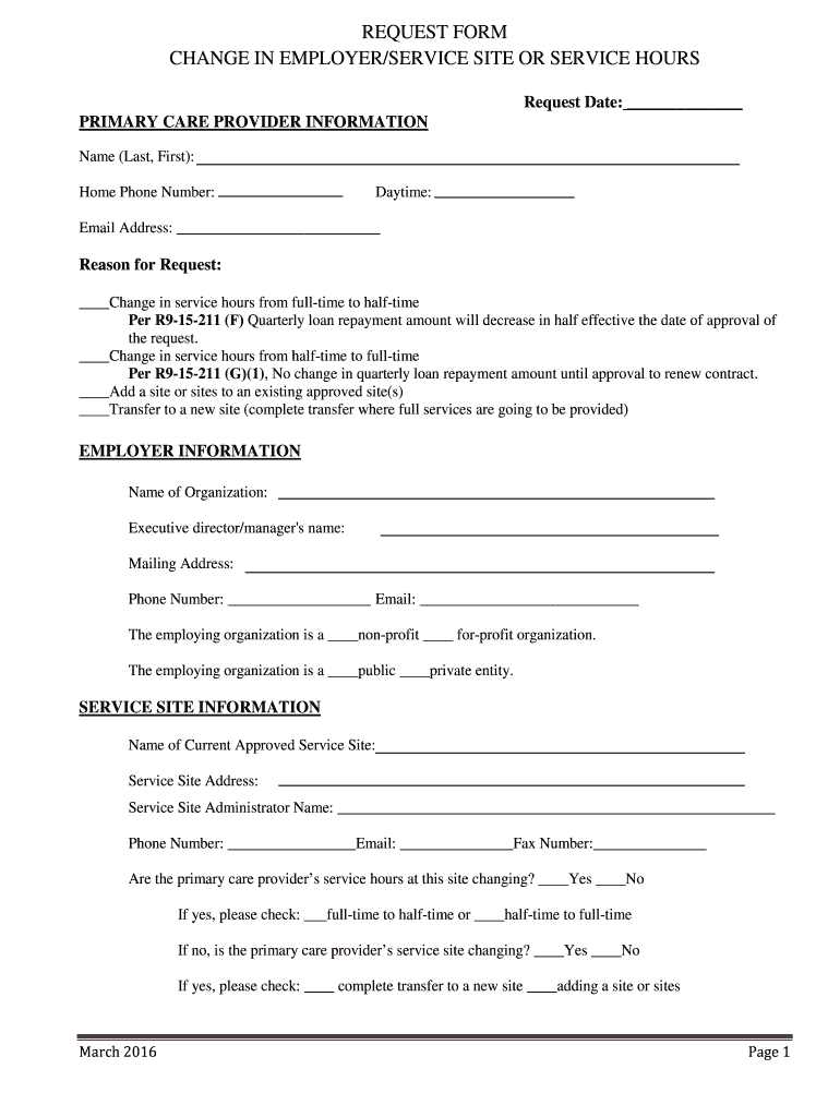 REQUEST FORM CHANGE IN EMPLOYER/SERVICE SITE OR SERVICE HOURS Request Date: PRIMARY CARE PROVIDER INFORMATION Name (Last, First): Home Phone Number:Daytime:Email Address: Reason for Request: Change