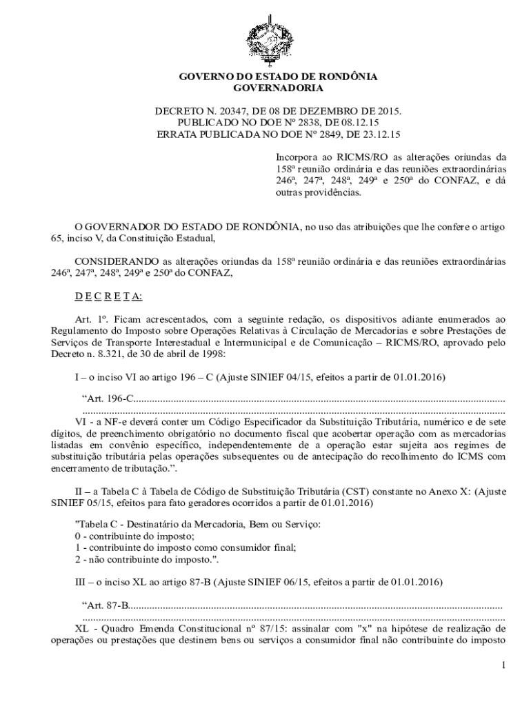GOVERNO DO ESTADO DE RONDNIA GOVERNADORIA DECRETO N. 20347, DE 08 DE DEZEMBRO DE 2015. PUBLICADO NO DOE N 2838, DE 08.12.15 ERRATA PUBLICADA NO DOE N 2849, DE 23.12.15 Incorpora ao RICMS/RO as alteraes