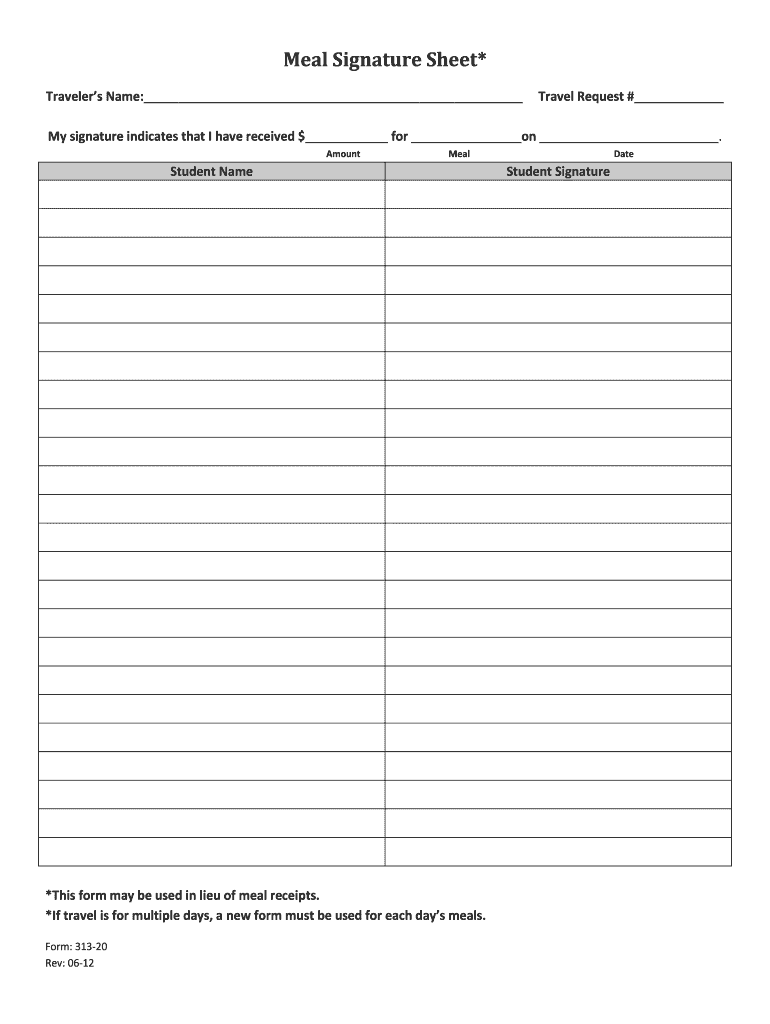 Meal Signature Sheet* Traveler s Name: Travel Request # My signature indicates that I have received $ for on. Amount Meal Student Name *This form may be used in lieu of meal receipts. *If travel is