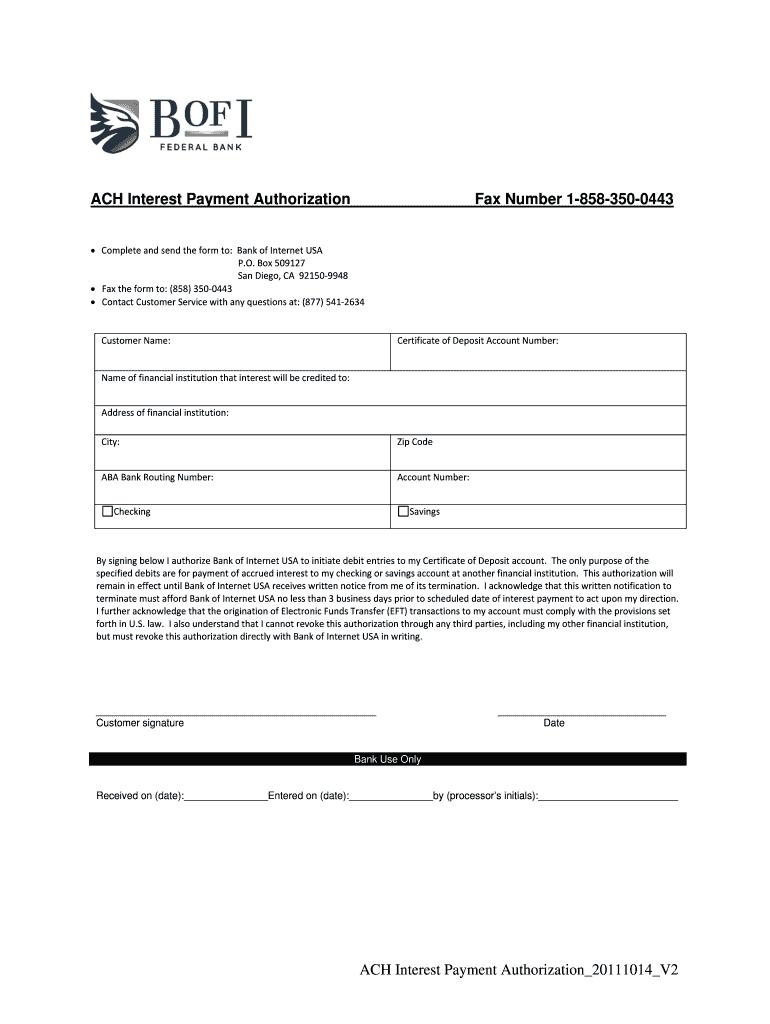 The ACH Interest Payment Authorization is a financial document used by Bank of Internet USA customers to authorize debit entries for interest payments to another financial institution.