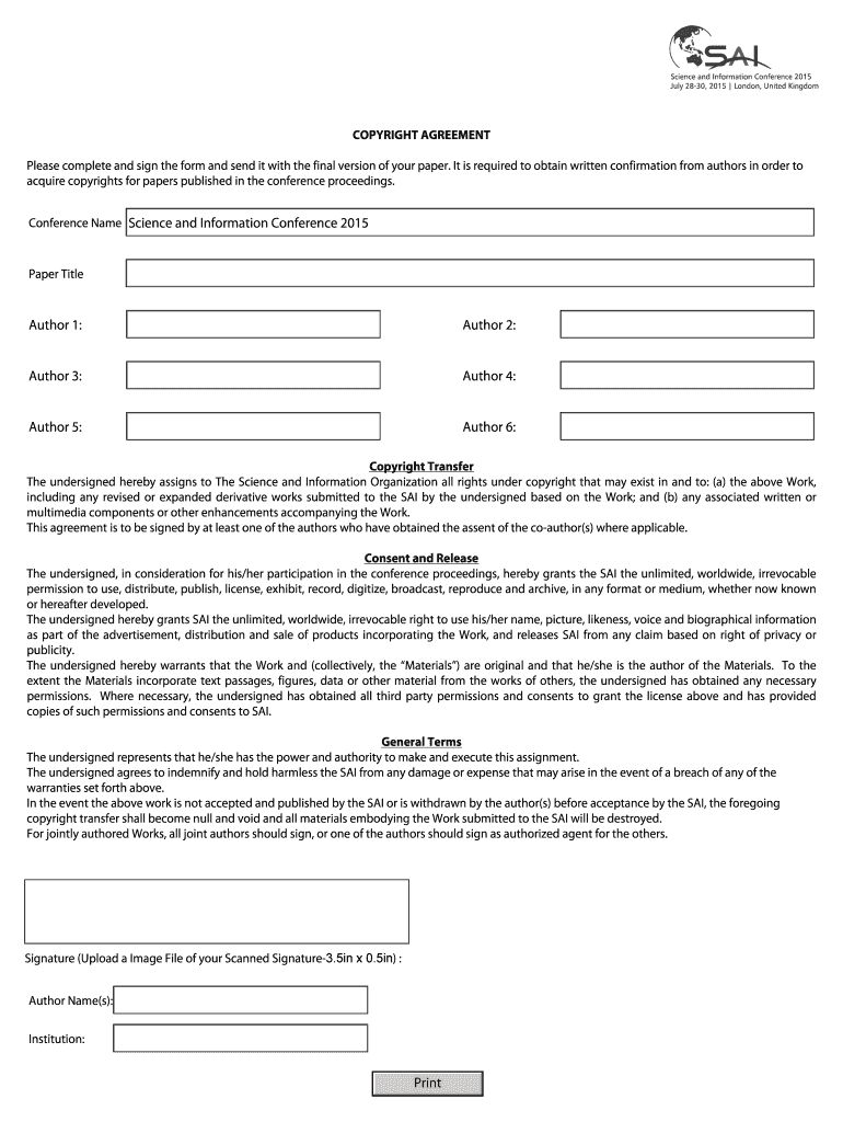 The Copyright Agreement for Conference Proceedings is a legal document used by authors to transfer copyrights for published papers to The Science and Information Organization.