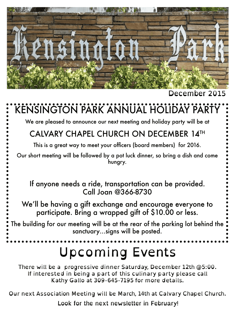 December 2015KENSINGTON PARK ANNUAL HOLIDAY PARTY We are pleased to announce our next meeting and holiday party will be Calvary CHAPEL CHURCH ON DECEMBER 14TH This is a great way to meet your officers