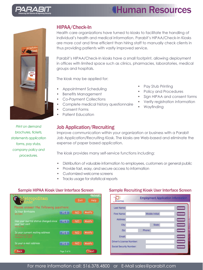 Human Resources HIPAA/Check-In Health care organizations have turned to kiosks to facilitate the handling of individual s health and medical information. Para bit s HIPAA/Check-In Kiosks are more