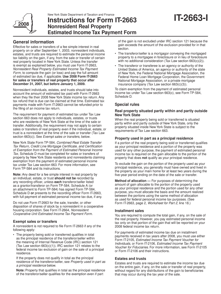 New York State Department of Taxation and Finance Instructions for Form IT-2663 IT-2663-I Nonresident Real Property Estimated Income Tax Payment Form General information Effective for sales or transfers