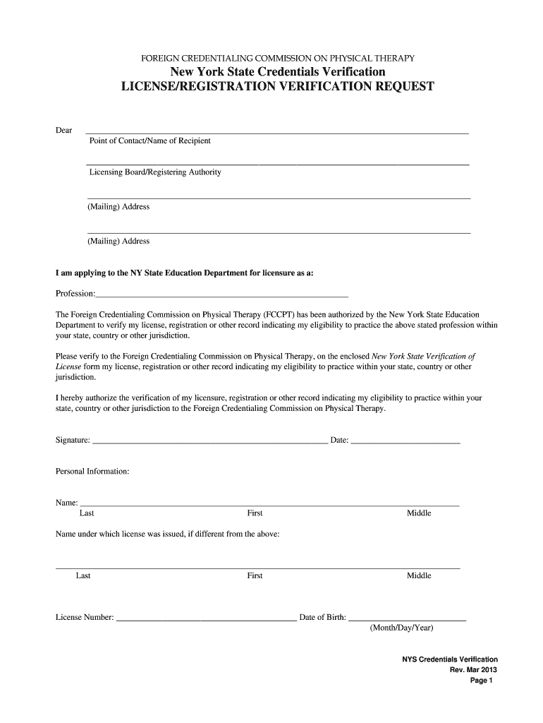 The New York State Credentials Verification Request is an essential form for individuals seeking licensure in New York. This form is significant as it initiates the verification of professional credentials crucial for obtaining a license. The Foreign Credentialing Commission on Physical Therapy (FCCPT) plays a vital role in this process, ensuring that applicants meet the required standards. The use of the ny credentials verification form allows for an efficient approach to credential verification in the realm of physical therapy licensing.