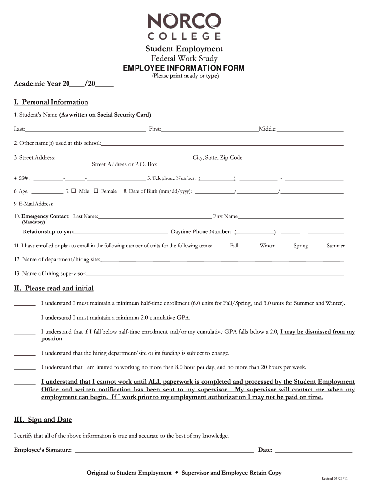 Get the free Federal Work Study Employee Information Form