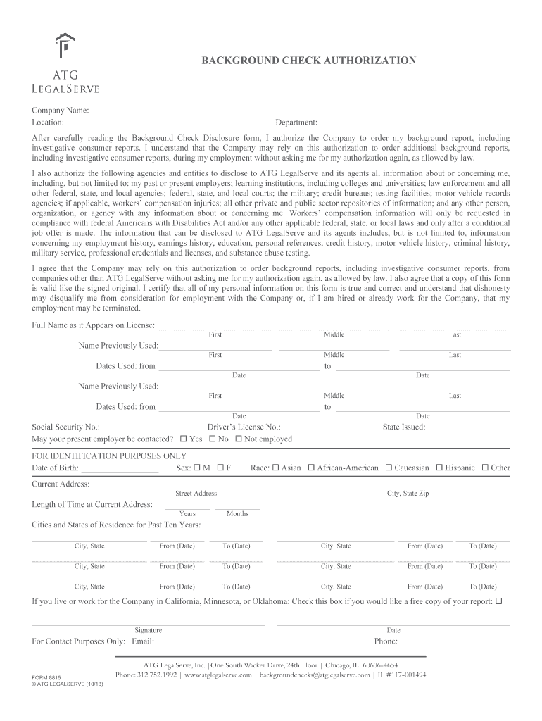 To complete the Background Check Authorization Form, you'll need to provide personal details such as your name, social security number, driver’s license number, current address, date of birth, and contact information.