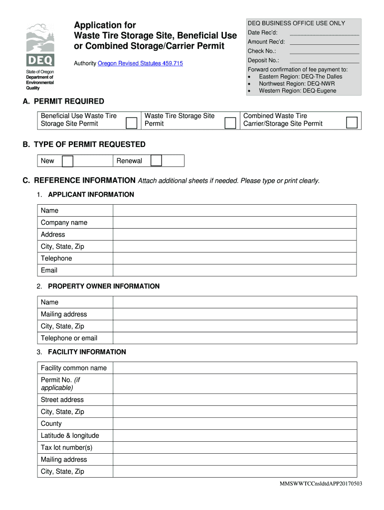 Application for Waste Tire Storage Site, Beneficial Use or Combined Storage/Carrier Permit Authority Oregon Revised Statutes 459.715DEQ BUSINESS OFFICE USE ONLY Date Recd: Amount Recd: Check No.: