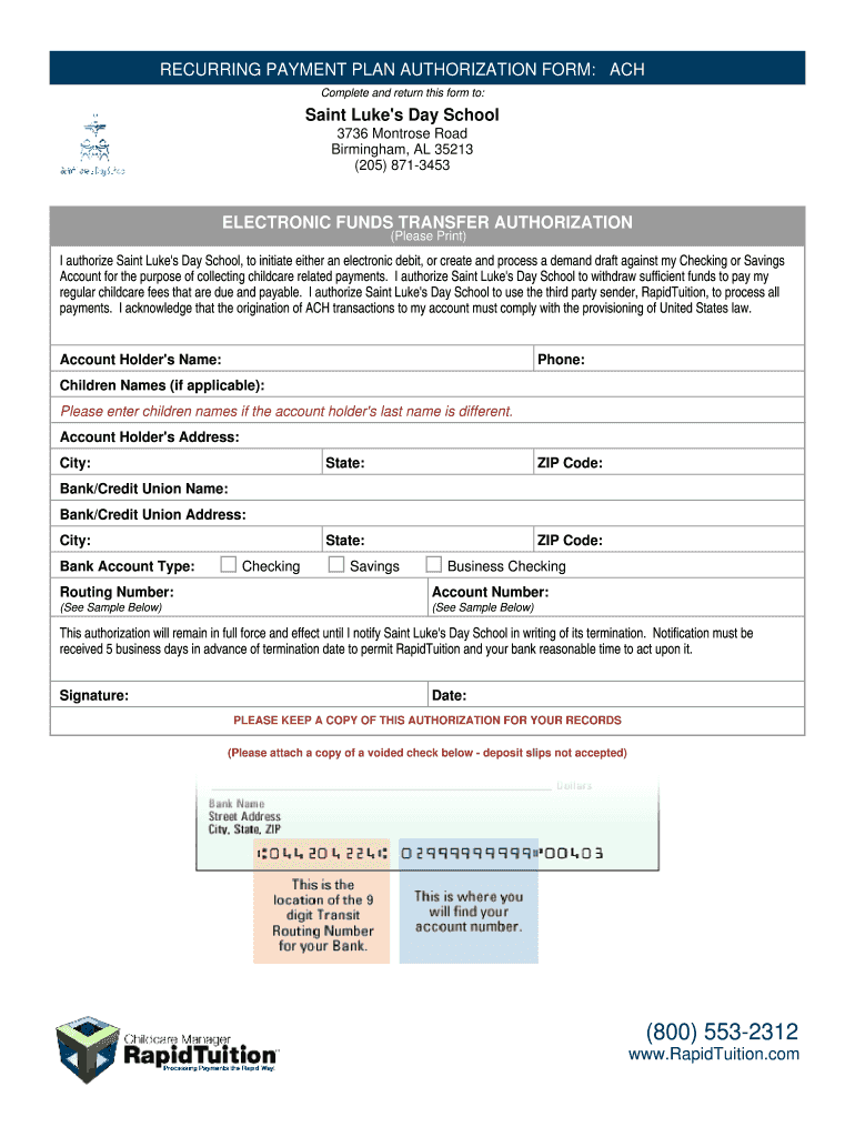 RECURRING PAYMENT PLAN AUTHORIZATION FORM: ACH Complete and return this form to: Saint Luke's Day School 3736 Montrose Road Birmingham, AL 35213 (205) 871-3453 ELECTRONIC FUNDS TRANSFER AUTHORIZATION
