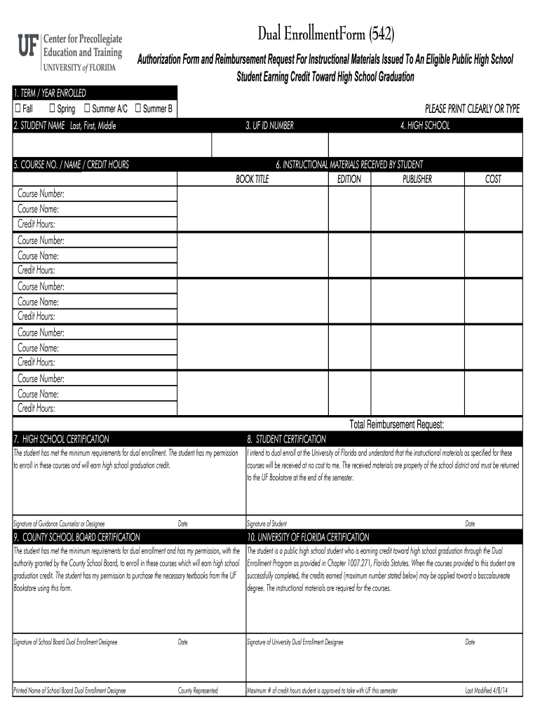 Public high school students in Florida looking to enroll at the University of Florida for dual credit courses must complete this form. Students must meet specific academic criteria set by their school district.