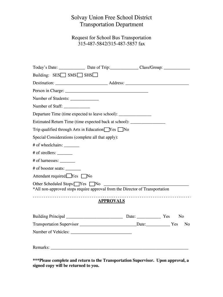Solvay Union Free School District Transportation Department Request for School Bus Transportation 3154875842/3154875857 autopays Date: Date of Trip: Class/Group: Building: SESSMSSHSDestination: Address: