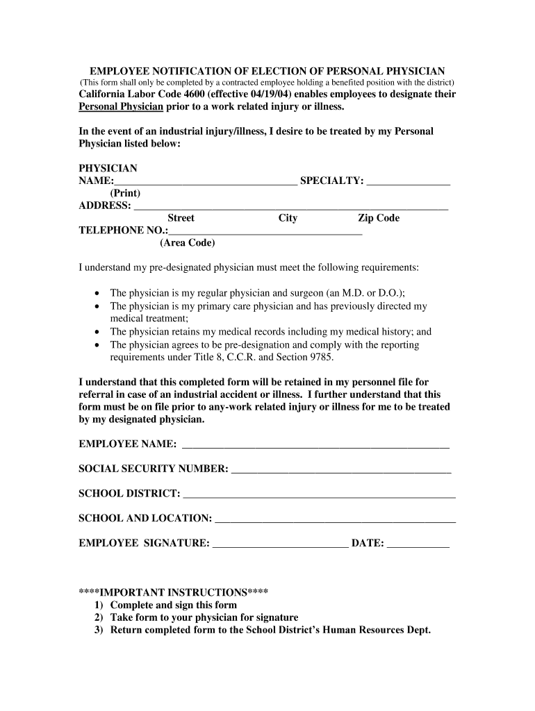 EMPLOYEE NOTIFICATION OF ELECTION OF PERSONAL PHYSICIAN (This form shall only be completed by a contracted employee holding a benefited position with the district) California Labor Code 4600 (effective