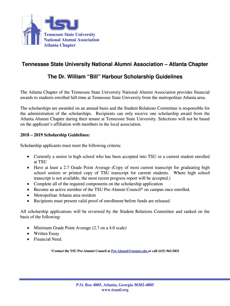 Tennessee State University National Alumni Association Atlanta Chapter Tennessee State University National Alumni Association Atlanta Chapter The Dr. William Bill Harbor Scholarship Guidelines The