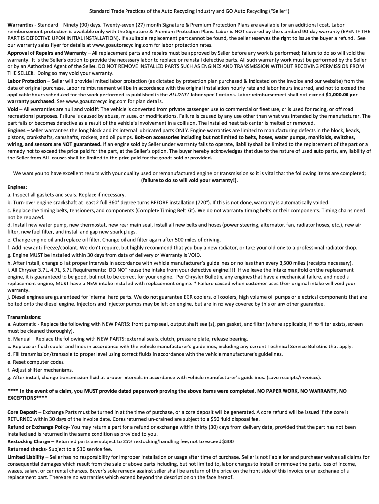 Get the free Standard Trade Practices of the Auto Recycling Industry and GO Auto Recycling (Seller)