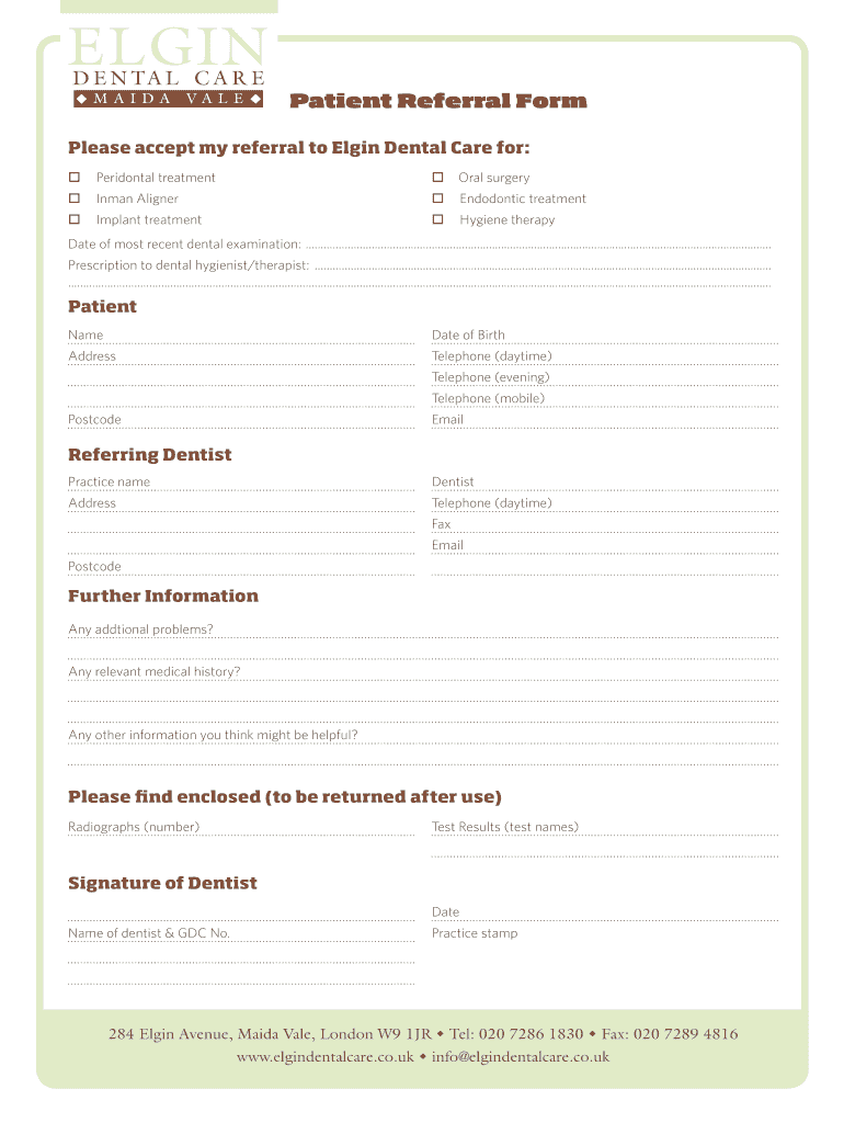 Patient Referral Form Please accept my referral to Elgin Dental Care for: ? Periodontal treatment ? Oral surgery ? Unman Aligner ? Endodontic treatment ? Implant treatment ? Hygiene therapy Date of