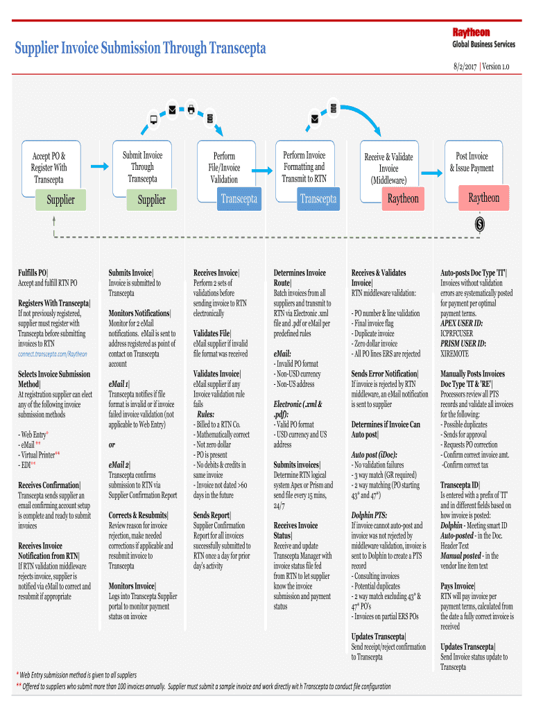 Supplier Invoice Submission Through Transept 8/2/2017 Version 1.0Submit Invoice Through TransceptaAccept PO & Register With TransceptaSupplierFulfills PO Accept and fulfill RTN PO Registers With Transept