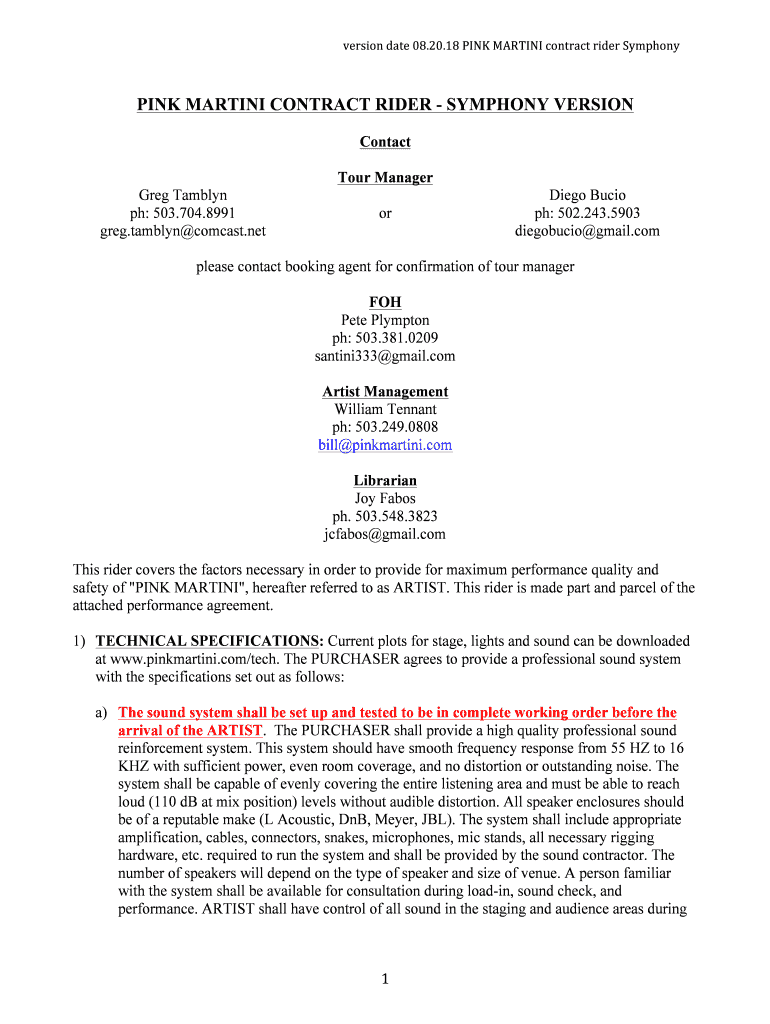 Version date 08.20.18 PINK MARTINI contract rider SymphonyPINK MARTINI CONTRACT RIDER SYMPHONY VERSION Contact Tour Manager Greg Tamely pH: 503.704.8991 Greg. Tamely Comcast.netorDiego Lucio pH: 502.243.5903