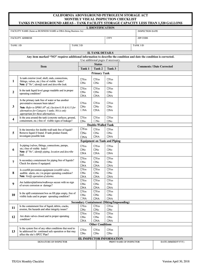 CALIFORNIA FOREGROUND PETROLEUM STORAGE ACT MONTHLY VISUAL INSPECTION CHECKLIST TANKS IN UNDERGROUND AREAS TANK FACILITY STORAGE CAPACITY LESS THAN 1,320 GALLONS I. IDENTIFICATION FACILITY NAME (Same