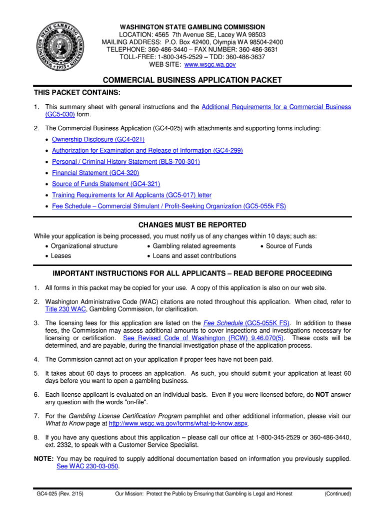 WASHINGTON STATE GAMBLING COMMISSION LOCATION: 4565 7th Avenue SE, Lacey WA 98503 MAILING ADDRESS: P.O. Box 42400, Olympia WA 985042400 TELEPHONE: 3604863440 FAX NUMBER: 3604863631 TOLL-FREE: 18003452529