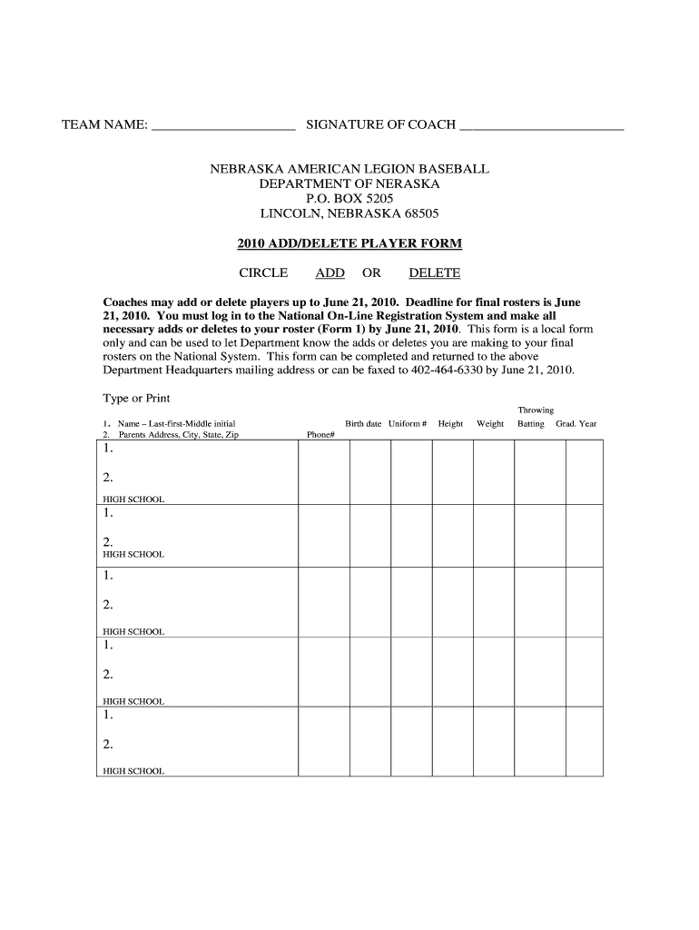 TEAM NAME: SIGNATURE OF COACH NEBRASKA AMERICAN LEGION BASEBALL DEPARTMENT OF NEBRASKA P.O. BOX 5205 LINCOLN, NEBRASKA 68505 2010 ADD/DELETE PLAYER FORM CIRCLE ADD OR DELETE Coaches may add or delete