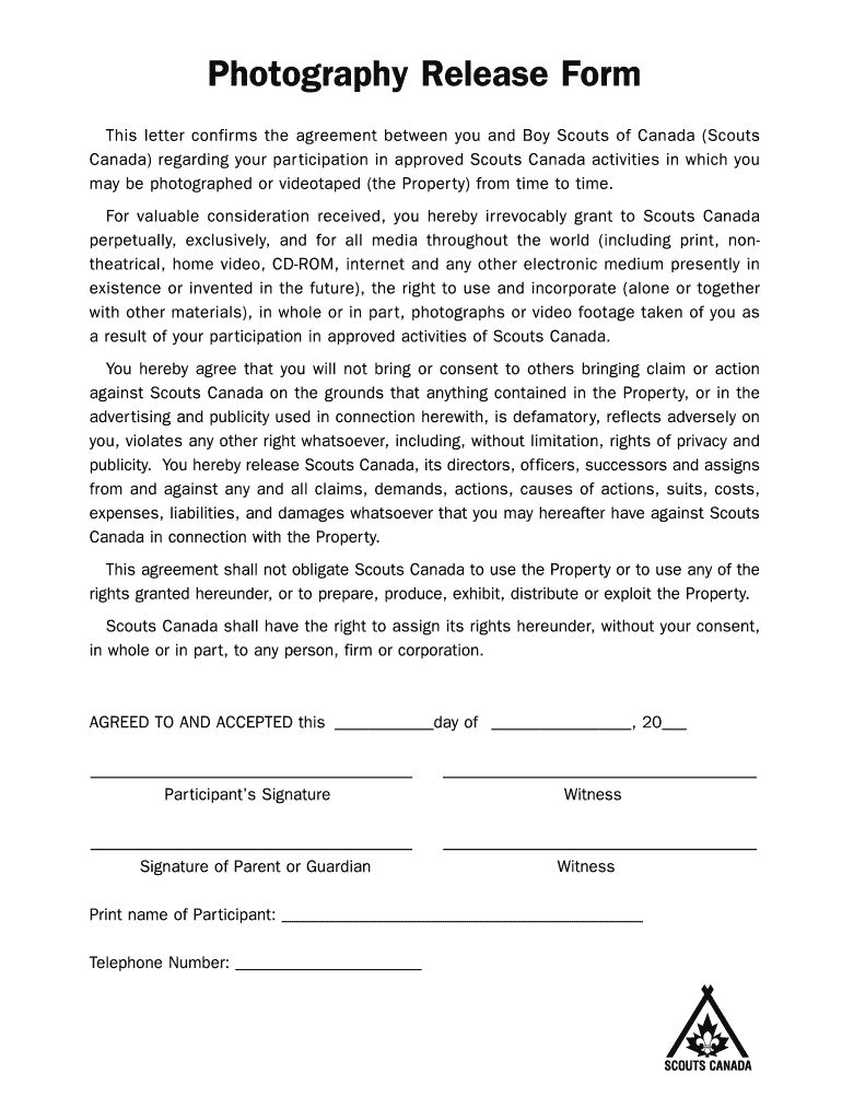 The Photography Release Form is a legal document used by Scouts Canada to grant rights for the use of photographs or video footage of participants in approved activities.