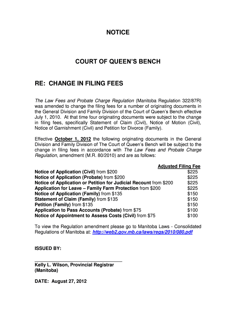 NOTICEBOARD OF QUEEN'S BENCH Benches RE: CHANGE IN FILING FEES