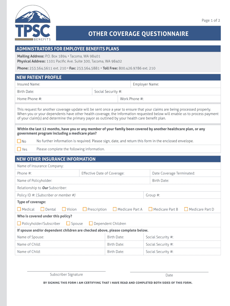 Page 1 of 2OTHER COVERAGE QUESTIONNAIRE ADMINISTRATORS FOR EMPLOYEE BENEFITS PLANS Mailing Address: P.O. Box 1894 Tacoma, WA 98401 Physical Address: 1101 Pacific Ave. Suite 300, Tacoma, WA 98402 Phone: