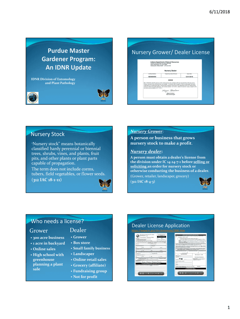 6/11/2018Nursery Grower/ Dealer Licensed Division of Entomology and Plant Pathology EntomologyINDIANANursery Stock “Nursery stock means botanically classified hardy perennial or biennial trees,