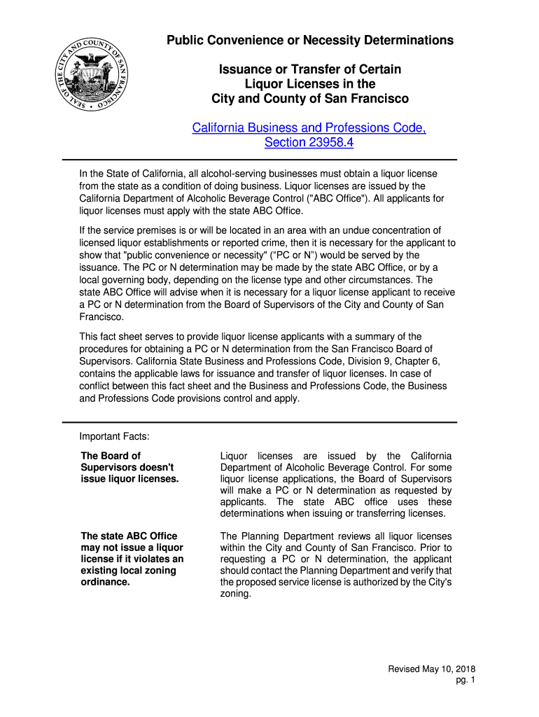 Public Convenience or Necessity Determinations Issuance or Transfer of Certain Liquor Licenses in the City and County of San Francisco California Business and Professions Code, Section 23958.4 In