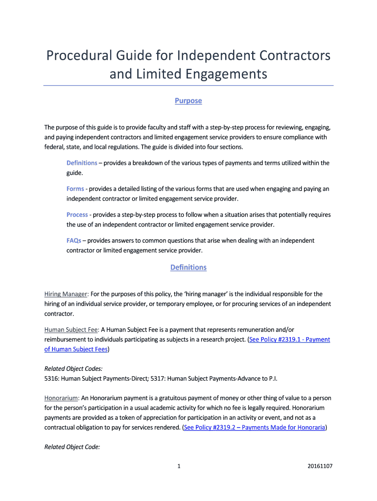 Procedural Guide for Independent Contractors and Limited Engagements Purpose The purpose of this guide is to provide faculty and staff with a stepsister process for reviewing, engaging, and paying