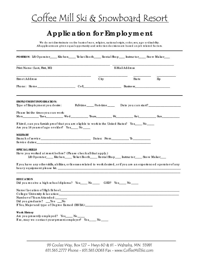 Coffee Mill Ski & Snowboard Resort Application for Employment We do not discriminate on the basis of race, religion, national origin, color, sex, age or disability. All applicants are given equal