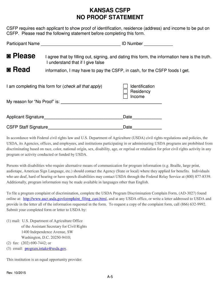 Get the free Kansas CSFP No Proof Statement