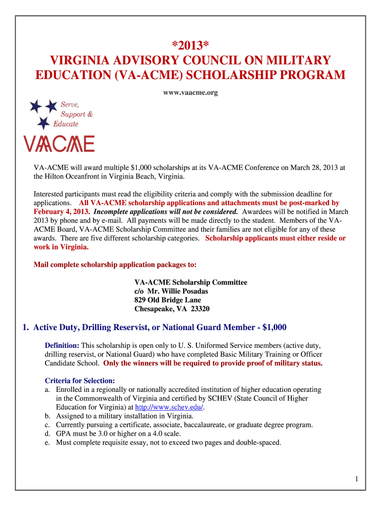 *2013* VIRGINIA ADVISORY COUNCIL ON MILITARY EDUCATION (VA-ACME) SCHOLARSHIP PROGRAM www.vaacme.org VA-ACME will award multiple $1,000 scholarships at its VA-ACME Conference on March 28, 2013, at