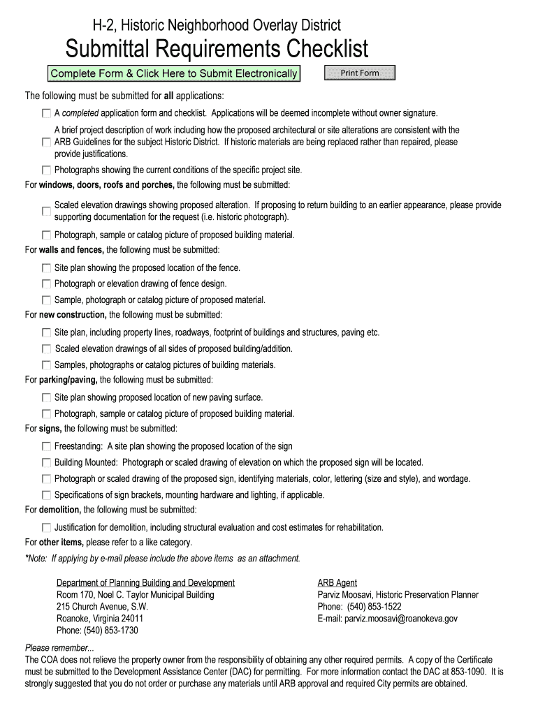 H₂, Historic Neighborhood Overlay DistrictSubmittal Requirements Checklist Complete Form & Click Here to Submit ElectronicallyPrint Forth following must be submitted for all applications: A completed
