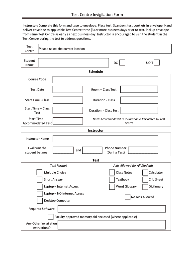 Obtain the test centre invigilation form from the appropriate institution or organization.