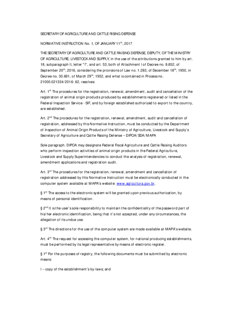 SECRETARY OF AGRICULTURE AND CATTLE RISING DEFENSE NORMATIVE INSTRUCTION No. 1, OF JANUARY 11th, 2017 THE SECRETARY OF AGRICULTURE AND CATTLE RAISING DEFENSE, DEPUTY, OF THE MINISTRY OF AGRICULTURE,