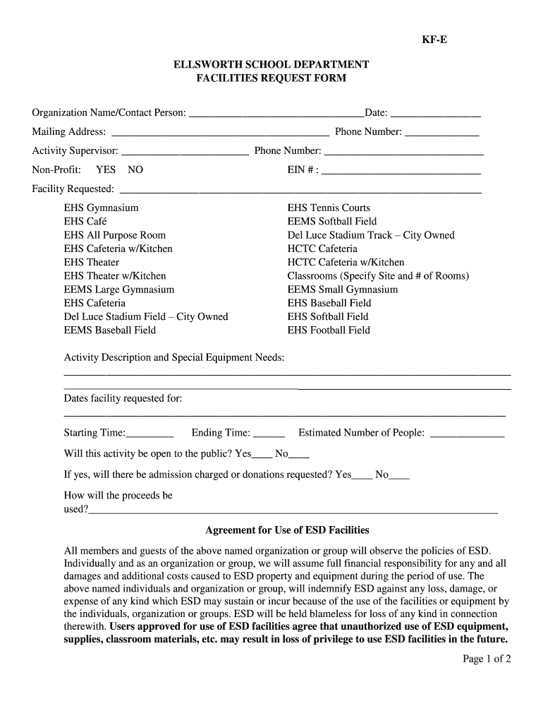 KBE ELLSWORTH SCHOOL DEPARTMENT FACILITIES REQUEST FORM Organization Name/Contact Person: Date: Mailing Address: Phone Number: Activity Supervisor: Phone Number: Nonprofit:HEINLEIN # : Facility Requested: