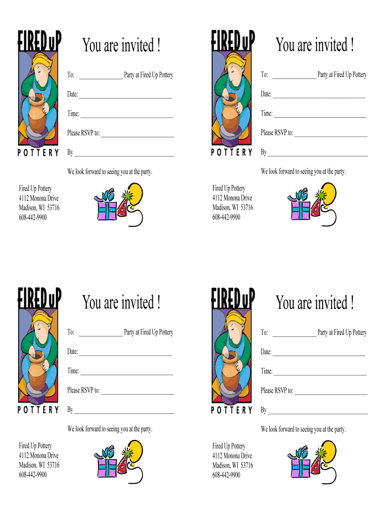You are invited ! You are invited ! To: Party at Fired Up Pottery: Party at Fired Up PotteryDate: Date: Time: Time: Please RSVP to: Please RSVP to: By We look forward to seeing you at the party. We