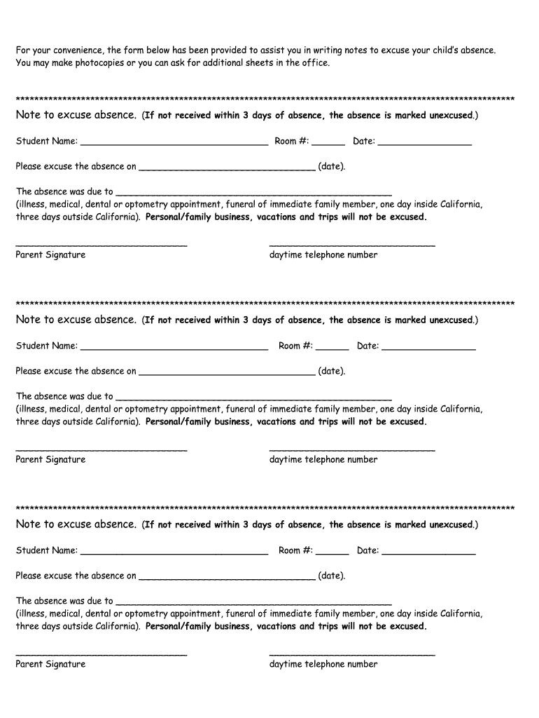 For your convenience, the form below has been provided to assist you in writing notes to excuse your child s absence. You may make photocopies, or you can ask for additional sheets in the office.